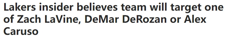 湖人跟队记者Jovan Buha表示:湖人可能会将交易目标瞄准拉文、德罗赞、卡鲁索其中之一。卡鲁索显然是湖人的最爱,不过湖人也有可能对拉文、德罗赞出手,他们已经对这两位球员有兴趣几个赛季了。所以,我认为他们三个其中之一也许会在交易截止日前成为湖人的目标,或者更早。