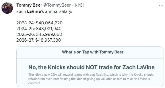 名记Tommy Beer列出拉文未来4年的薪水——23-24赛季4064万美元,24-25赛季4303万美元,25-25赛季4600万美元,26-27赛季4899万美元,还表示尼克斯应该不会通过交易追求拉文。