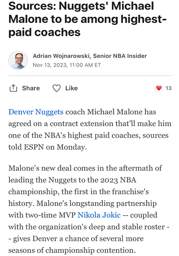 马龙续约!成NBA最高薪教练之一,率队夺冠创历史,力争卫冕