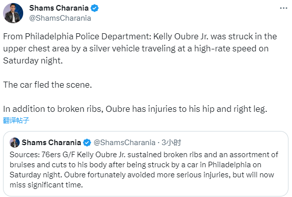 shams进一步报道,来自费城警局的事故报告,周日晚上,乌布雷被一辆高速行驶的银色车辆撞到上胸部, 该车逃离现场; 除了肋骨骨折外,乌布雷的臀部和右腿也受伤了。