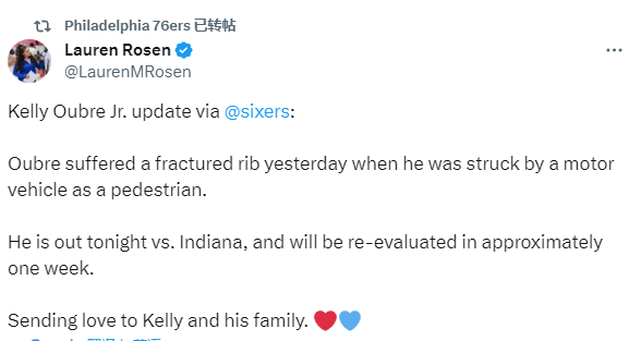 76人官方公布乌布雷的伤情,肋骨骨折,大概一周后接受复查。