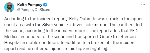 76人记者Keith Pompey透露,乌布雷的胸部被肇事车辆的后视镜撞到,肇事者逃离现场;随后乌布雷被送到杰斐逊医院。