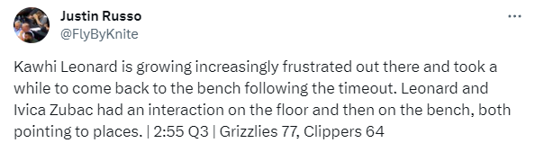快船5连败队内还出现不和事件,据快船随队记者Justin Russo赛间报道,在第三节还剩2分55秒时(当时快船64-77落后),小卡的情绪变得越来越沮丧,在暂停后,他花了一些时间才回到替补席。小卡与祖巴茨在场上、替补席上都进行了交流,两人都指着对方的场上位置。