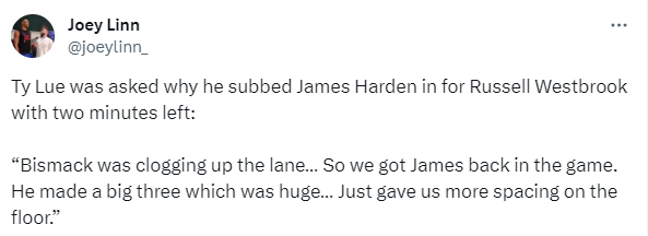 当被问及为何在比赛还剩2分钟时用哈登换下威少,卢说道:比永博当时堵住了突破路线,所以我决定让哈登回来,他投进了一个非常关键的三分,给了我们更多的场上空间。
