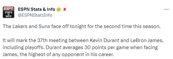 据统计,这将是杜兰特和詹姆斯生涯的第37次交锋(包含季后赛)。杜兰特此前在面对詹姆斯时,场均能够得到30分,成为詹姆斯生涯场均得分最高的对手。