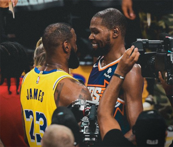 本赛季湖人和太阳第一次交手时,詹姆斯拿到21分8篮板9助攻,携手浓眉捍卫主场,杜兰特空砍39分11篮板;如今詹杜在季中锦标赛相遇,湖人将在四连客的最后一场挑战太阳;NBA官方晒两人昔日赛场对位照,为这一场焦点战预热。