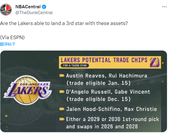 ESPN列出了湖人的现有交易资产,并发问:“这些能为球队换来第三位球星吗?”湖人可用交易资产如下——里夫斯、八村垒(2024年1月16日可交易)、拉塞尔、文森特(2023年12月16日可交易)、席菲诺、克里斯蒂、2029或2030年的首轮签以及2026年或2028年的选秀签互换权。