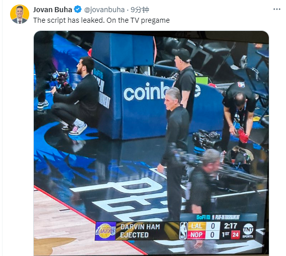 另外值得一提的是,TNT转播方犯错误,第一节2分17秒两队比分0-0,居然还写道:湖人主帅哈姆被驱逐。