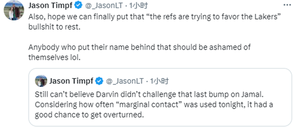 NBA记者JasonTimp对穆雷最后时刻造成詹姆斯犯规表示质疑:仍然不敢相信达尔文-哈姆没有挑战最后对穆雷的接触。考虑到今晚‘轻微接触’这个词被频繁使用的程度,那个球有很大的机会被改判。此外,希望不要再提‘裁判在试图偏向湖人’的屁话了。谁要是实名说那种话,应该感到羞耻。”