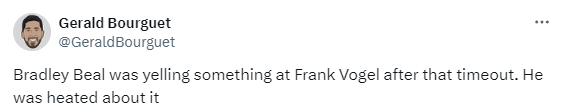 末节,太阳三巨头带队却被森林狼15-5拉开分差,7分51秒太阳落后17分,沃格尔无奈喊掉球队的最后一个暂停;森林狼球迷身穿嘲讽布克的T恤,太阳落后还爆发不和谐一幕,据太阳记者报道,暂停后比尔暴怒并且冲着沃格尔怒吼;杜兰特继续带队抵抗,无奈分差太大,2分17秒布克犯满毕业,太阳撤下主力提前认输。