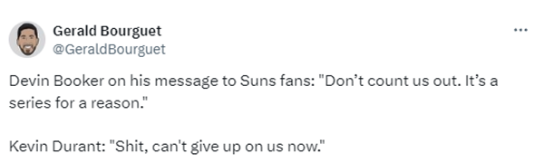 太阳0-2落后,赛后布克寄语球迷,表示:不要把我们排除在外。这是一个系列赛,这是有原因的。我认为到目前为止,没有任何客场球队获胜。我知道这与我们无关,但情况就是这样。(实际上雄鹿主场不敌步行者,已经出现客队赢球)