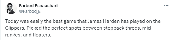 快船随队记者Farbod盛赞哈登,发推写道:今天这场无疑是哈登快船生涯最佳一战,投篮出手选择完美,有后撤步、中距离、还有抛投。
