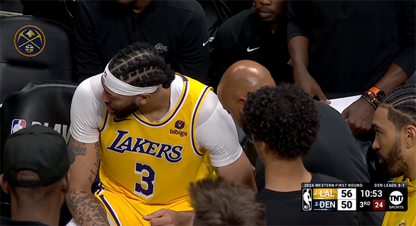 第三节10分53秒,浓眉在篮下和波特撞了一下肩膀,之后浓眉捂着肩膀痛苦倒地不起,詹姆斯赶紧坐过去,湖人队医过来查看浓眉的伤势,詹姆斯和拉塞尔都站在浓眉旁边,一脸担忧的表情;湖人主帅哈姆同样十分担忧。