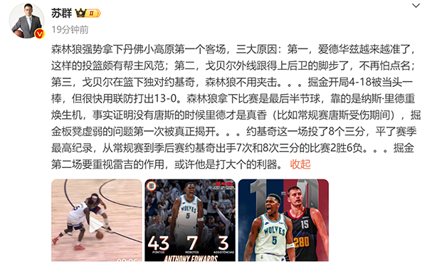 爱德华兹 43 分创历史,诺维茨基盛赞,苏群:有帮主风范