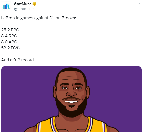 根据赛程,湖人将在11月9日客场对阵火箭,今日谈到将对抗詹姆斯,狄龙-布鲁克斯表示:我已经准备好锁死他了;美媒StatMuse更新社媒,晒出了詹姆斯面对狄龙的数据——场均25.2分8.4篮板8助攻52.5%投篮命中率,9胜2负。