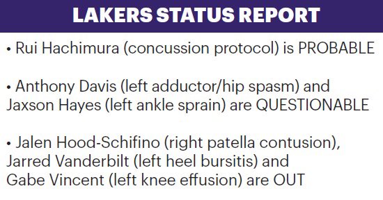 目前湖人全队有6名球员受伤,3人因伤继续休战,浓眉、八村垒和海斯都有望出战火箭;反观火箭队,伊森预计复出,出场时间限制在15分钟左右,惠特摩尔已经被下放到发展联盟毒蛇队。
