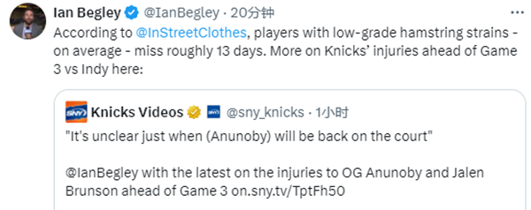 据纽约记者Ian Begley报道,目前还不清楚阿努诺比何时能够重返赛场,根据医学专家Jeff Scotts的报道,球员遭遇腿筋轻微拉伤,平均伤停13天;根据赛场,即使尼克斯和步行者打到抢七,这轮系列赛还有10天,换言之,阿努诺比很可能缺席次轮剩余的比赛。