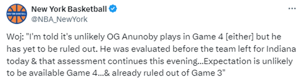 尼克斯伤病满营,兰德尔、博扬和米罗因伤提前报销,悍将阿努诺比何时能够回归?系列赛G2,阿努诺比在第三节的一次进攻中意外受伤,拉伤左腿筋,一瘸一拐离场并且提前伤退,G3确定打不了,woj报道,阿努诺比G4也不太可能出战。