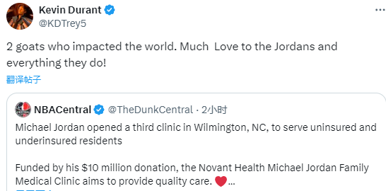 61岁乔丹捐款1000万建诊所 杜兰特称两GOAT改变世界