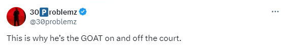 对于乔丹的善举,球迷热议并且表示这就是乔丹在场内外都是GOAT的原因,太阳球星杜兰特则发推写道:两个GOAT(历史最佳)都影响了世界,非常喜欢乔丹一家和他们所做的一切!