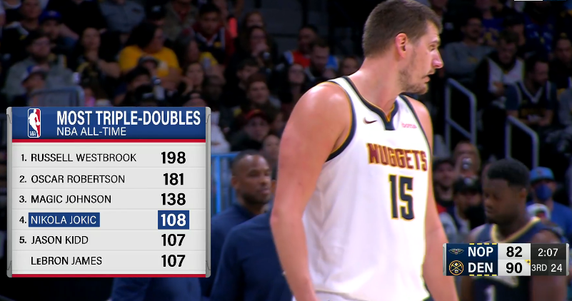 2、约基奇职业生涯第108次三双,正式超越詹姆斯和杰森-基德,独享历史三双榜第4位,排在历史前三的依次是威少198次、罗伯特森181次和魔术师139次;约基奇年仅28岁,未来他很有可能超越威少成为新的历史三双王。