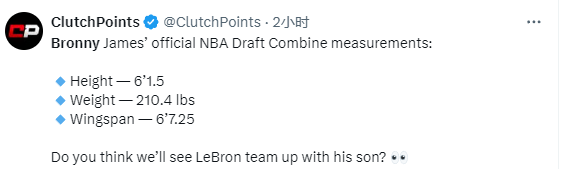 布朗尼的联合试训体侧数据已经出炉,裸足身高6英尺1.5英寸(186.69厘米,约1米87),体重210.4磅(约95公斤),臂展6英尺7.25英寸(约2米01),站立摸高8英尺2.5英寸(约2.5米),原地起跳摸高约为3米07;美媒ClutchPoints表示:你认为我们能看到勒布朗和他的儿子联手吗?