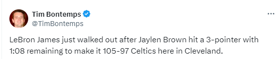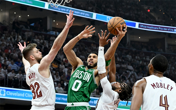 来源:24直播网05-14 10:5224直播网讯 北京时间5月14日,NBA东部半决赛凯尔特人G4客场再次击败骑士,总比分3-1夺赛点;米切尔因小腿拉伤而缺席,塔图姆全场25投11中拿到33分11篮板5助攻2抢断,首节爆发独砍16分,布朗全场27分8篮板,制胜三分打得詹姆斯提前离场,双探花带队夺赛点,距离东决仅差一胜;詹姆斯现身克利夫兰观战,骑士仍输掉关键一战。