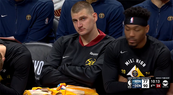第三节,森林狼打出11-3攻势反超比分,随后约基奇得分和助攻两手同时抓,梦幻脚步戏耍戈贝尔并且打板命中,鬼魅传球串联全队,约基奇带队打出23-8的进攻高潮,掘金领先到15分;面对森林狼的反扑,约基奇继续强吃戈贝尔和里德,强吃戈贝尔打成2+1太无解,三节打完掘金领先14分,这一节约基奇7中6独砍16分4助攻,全场球迷高呼MVP。