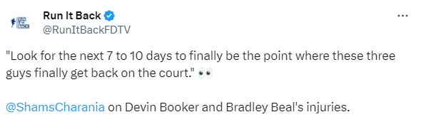 按照比尔和布克至少再缺席一周来算,他们将缺席接下来的4场比赛,分别是对阵公牛、湖人、雷霆和森林狼,他们可能会在11月18日对阵爵士复出,这一天可能是太阳新三巨头在常规赛的首秀。