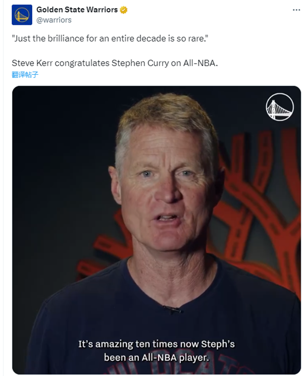 库里发推庆贺入选最佳阵容,勇士将帅:杀手、GOAT 祝贺