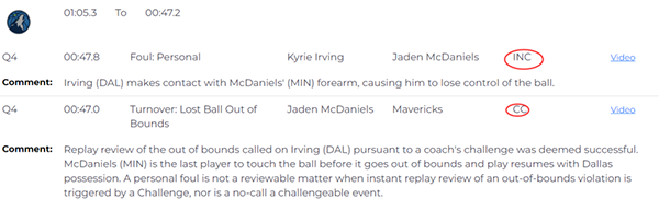 当时,裁判原先对此球的判罚是欧文出界,独行侠随后发起挑战,回放中心确认这一出界球是麦克丹尼尔斯最后接触,宣布挑战成功,把球权还给独行侠。报告指出,当挑战的是界外球时,个人犯规不属于可以审查的项目。