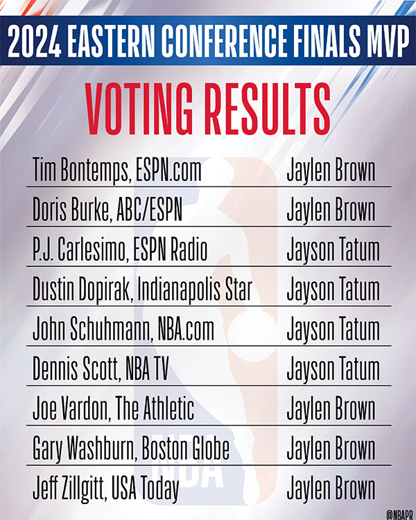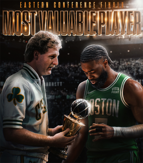 布朗力压塔图姆夺得今年东决MVP(最有价值球员),这是布朗生涯第一次荣获拉里-伯德奖杯;在27岁前分区决赛总得分榜单上,塔图姆757分高居历史第一,杰伦-布朗(653分)排名第二,科比(652分)掉到历史第三。