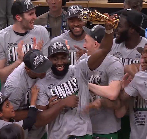 赛后塔图姆把篮球扔向空中,与队友一起疯狂庆祝,之后布朗险胜塔图姆夺得东决MVP,布朗大笑高举奖杯,全队为他欢呼庆祝。