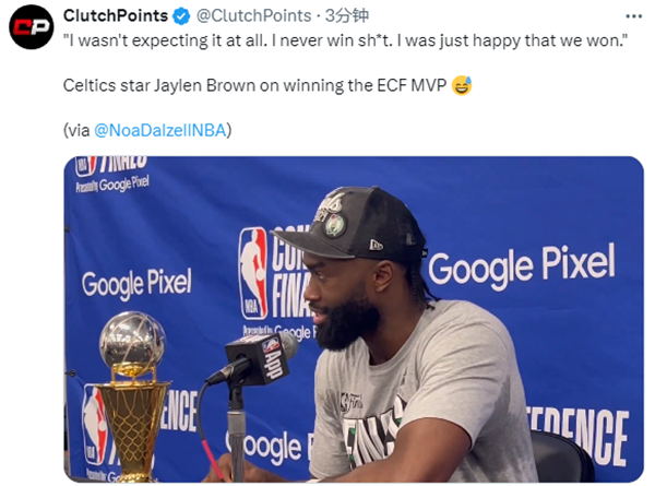 赛后谈到赢得东决MVP,杰伦-布朗表示:我完全没有想到,我从来没有想过,我什么TM都没赢得过,我只是很高兴我们赢了。