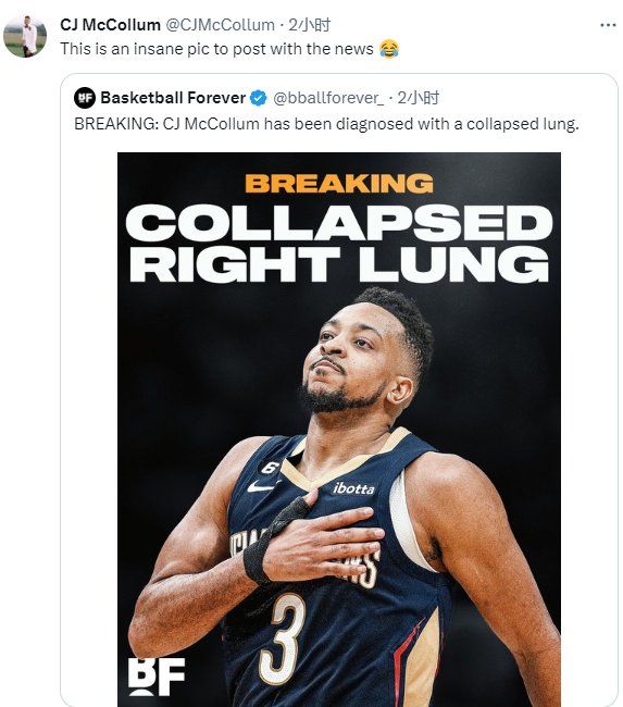 美媒Basketball Forever转发麦科勒姆病情并配上CJ捂心口的照片,CJ本人转发并吐槽道:这图配上这新闻也太搞了。