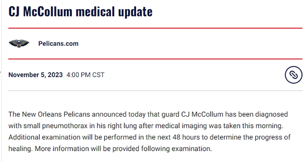麦科勒姆是鹈鹕队核心控卫,恐因气胸病情缺席多场比赛,他的缺席将是对鹈鹕的一大重创,希望CJ的身体无大碍。