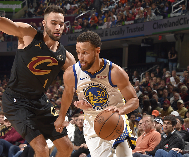下半场,面对骑士的火力,库里第三节输送火力,单节又命中3个三分,持球单挑斯特鲁斯,一顿操作后轰进撤步三分太狠,汤普森和库明加输送三分,不过三节打完,勇士仍旧落后,落后9分进入末节;库里单节又拿到12分。