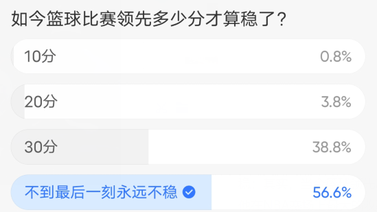 领先30分稳吗?不到4成的网友持赞同观点,在这样的情况下,对球员的心态是一种巨大的考验,落后一方的球员容易出现提前放弃的心态,反之领先一方的球员容易松懈;NBA赛场上也存在至少30分逆转的情况,快船曾在季后赛31分逆转勇士,爵士曾36分逆转掘金,不过这种情况发生的概率不大。