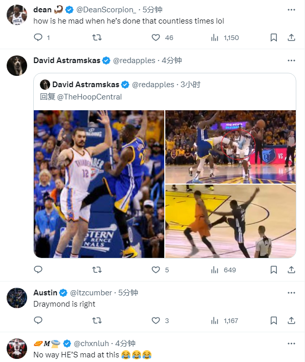 很明显,格林是在抱怨裁判无视自己裆部被踢这件事;格林抱怨引热议,有球迷表示格林说得对,还有球迷表示他不可能对此生气,他干过很多次之后他怎么生气了,更有球迷晒出格林伸腿伤人的黑历史。