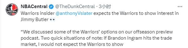Slater表示,如果英格拉姆进入交易市场,勇士不会对他表现出兴趣,不过,若热火要交易吉米-巴特勒,预计勇士至少会在某种程度上进入交易讨论。