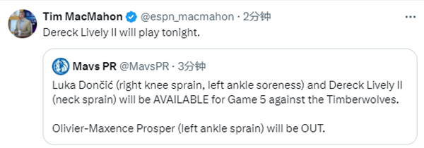 名记Shams透露:独行侠中锋莱夫利有望在G5复出