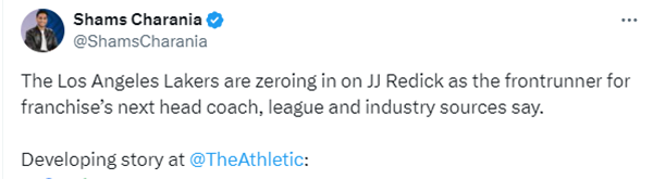 据此前报道,包括湖人记者Dan Woike在内多位记者都表示湖人最终会聘请雷迪克担任下一任主教练,Dan Woike表示:我认为湖人最终会选择JJ-雷迪克,这正朝着这个方向发展而且已经持续了很长一段时间。詹姆斯-博雷戈本周给很多人留下了深刻印象。如果JJ-雷迪克得到主教练的职位,湖人队将非常有兴趣聘请博雷戈担任首席助理。