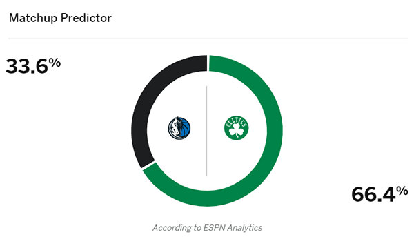 来源:24直播网06-08 11:2424直播网讯 北京时间6月8日,总决赛G1打完后,凯尔特人总比分1-0领先独行侠,今日ESPN预测总决赛第二场的胜率——凯尔特人66.4%,独行侠33.6%,很明显美媒看好绿军在主场拿下G2。