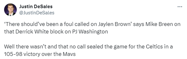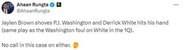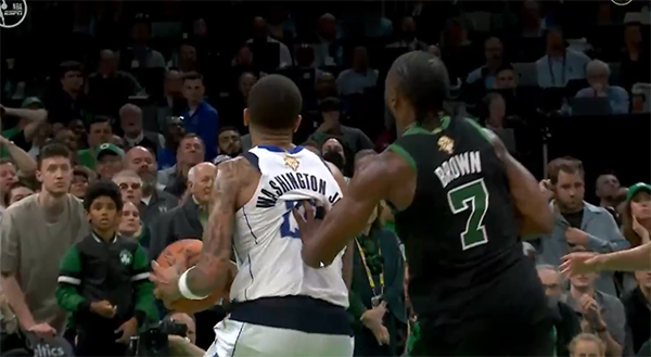 比赛还剩50多秒,独行侠反击快攻,欧文基地传球,PJ-华盛顿接球后想要扣篮,却惨遭杰伦-布朗和怀特双人拦截,转播方多次回放华盛顿扣篮前被布朗推了一把,裁判没有任何吹罚,这一回合引争议,名嘴迈克-布朗直言:这不是一个好帽,那应该吹罚布朗推人犯规。