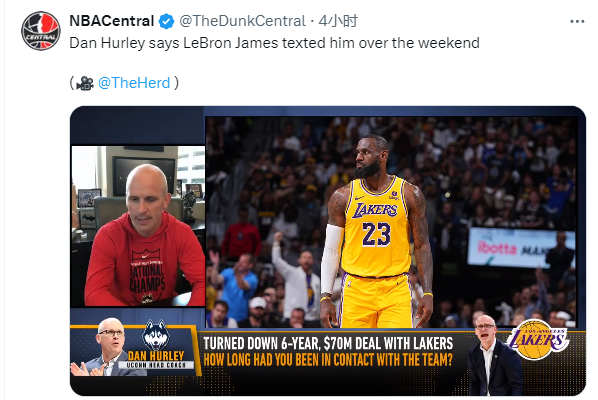 据此前报道,赫尔利拒绝了湖人6年7000万美元的报价,平均年薪约为1167万美元;外界质疑赫尔利借助湖人来抬高续约,对此赫尔利表示:我听说过最糟糕之一的说法是,这是我为了改善自己在康涅狄格大学的处境而采取的一种杠杆手段。我不需要什么杠杆手段。我们连续两年都赢得了全国冠军。