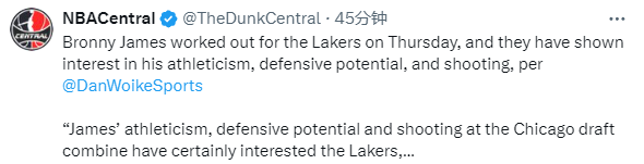 在选秀方面,Dan Woike报道称,今天布朗尼-詹姆斯为湖人进行了试训,在芝加哥联合试训期间,布朗尼的运动能力、防守潜力和投篮能力无疑引起了湖人的兴趣。若詹姆斯今年夏天以自由球员的身份重返球队,那么湖人可以通过选秀让布朗尼和勒布朗搭档来创造历史。