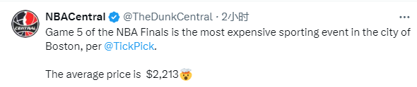 凯尔特人G4客场38分惨败,最多落后48分,很明显,塔图姆和布朗有望G5反弹并且带队拿下总决赛,而且绿军G5主场最低票价为1714美元,创波士顿市竞技体育最贵票价,均价为2213美元,按照球馆能够容纳18600人来算,绿军靠门票,一场就能狂赚4116万美元。