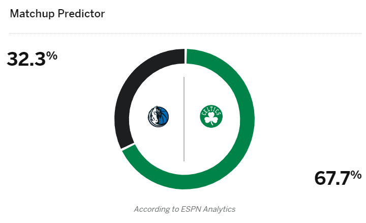虽然G4主场38分大胜,但目前独行侠总比分1-3落后,接下来的每一场都是生死战,ESPN预测G5胜率,凯尔特人67.7%,独行侠32.3%,ESPN看好凯尔特人G5主场夺冠。
