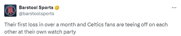 绿军的惨败导致北岸花园球馆内的观赛派对爆发激烈的殴打冲突——一位年轻球迷(身穿绿军34号球衣)连续挥拳击打另一位老球迷的头部,年轻人挥拳暴打大叔,后者被打倒而且面部被打出血,现场安保人员推开打人者,试图平息事态,之后大叔又和另外一名球迷打起来。