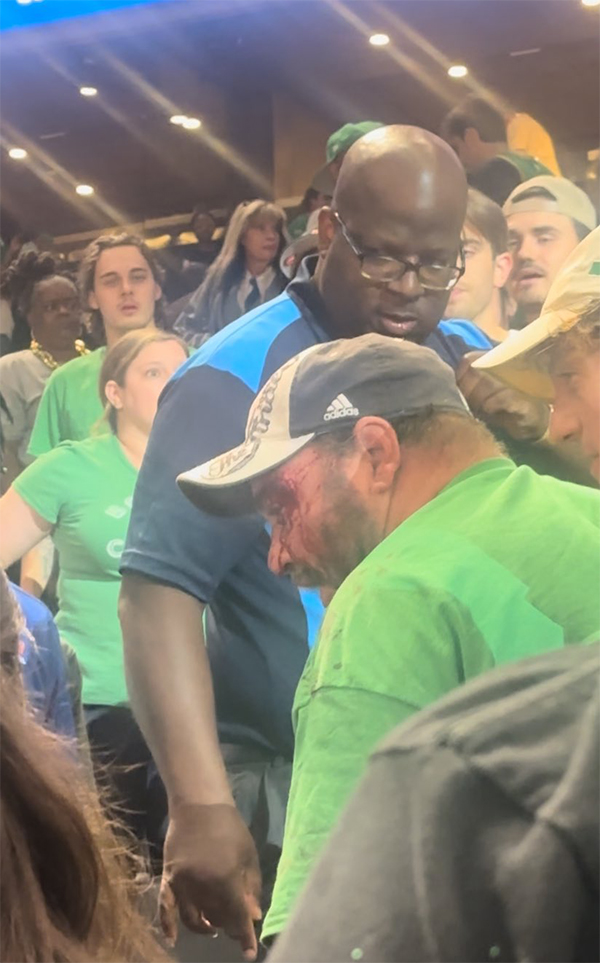 24直播网讯 北京时间6月16日,在总决赛G4遭遇38分惨败的比赛中,凯尔特人球迷之间发生火爆冲突,一球迷连续挥拳击打另一球迷的头部,后者头破血流被打惨了。